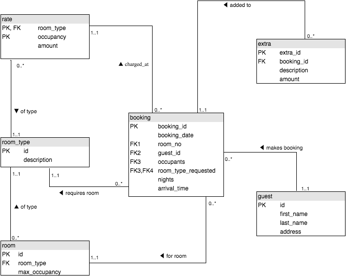 +------------+--------------+---------+----------+-----------+---------------------+--------+--------------+ | booking_id | booking_date | room_no | guest_id | occupants | room_type_requested | nights | arrival_time | +------------+--------------+---------+----------+-----------+---------------------+--------+--------------+ | 5001 | 2016-11-03 | 101 | 1027 | 1 | single | 7 | 13:00 | | 5002 | 2016-11-03 | 102 | 1179 | 1 | double | 2 | 18:00 | | 5003 | 2016-11-03 | 103 | 1106 | 2 | double | 2 | 21:00 | | 5004 | 2016-11-03 | 104 | 1238 | 1 | double | 3 | 22:00 | +------------+--------------+---------+----------+-----------+---------------------+--------+--------------+